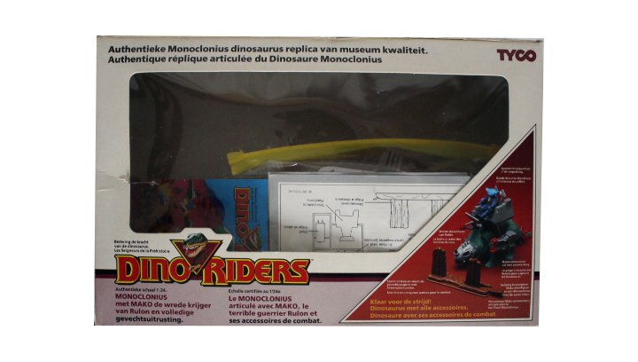 Dino Riders Monoclonius met Mako de Wrede Krijger, Tyco 1987. Compleet en als nieuw maar in open doos.